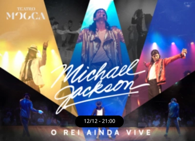 Michael Jackson: O Rei Ainda Vive75 minutos.Teatro Mooca - Mooca Plaza ShoppingDia 12 de Dezembro (sexta)às 21h